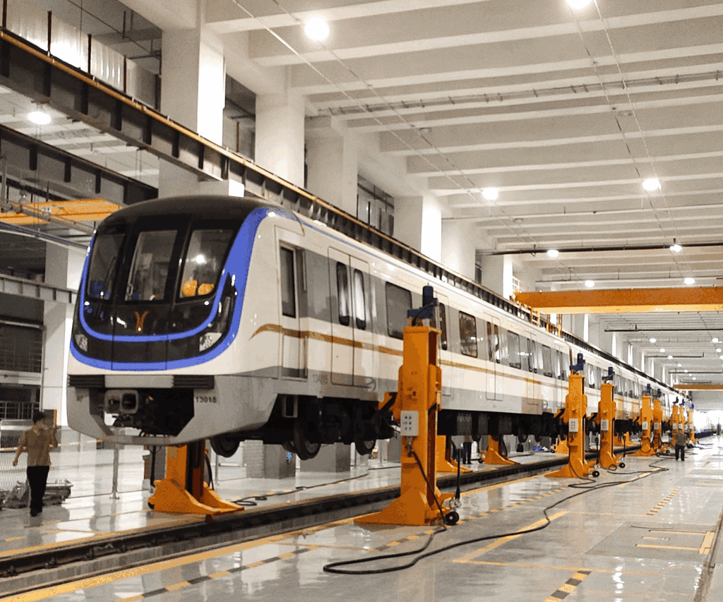 移動(dòng)式架車機(jī),4臺(tái)為一編組,可靈活組合,實(shí)現(xiàn)對(duì)單節(jié)車或任意連續(xù)編組的架、落車作業(yè)。
